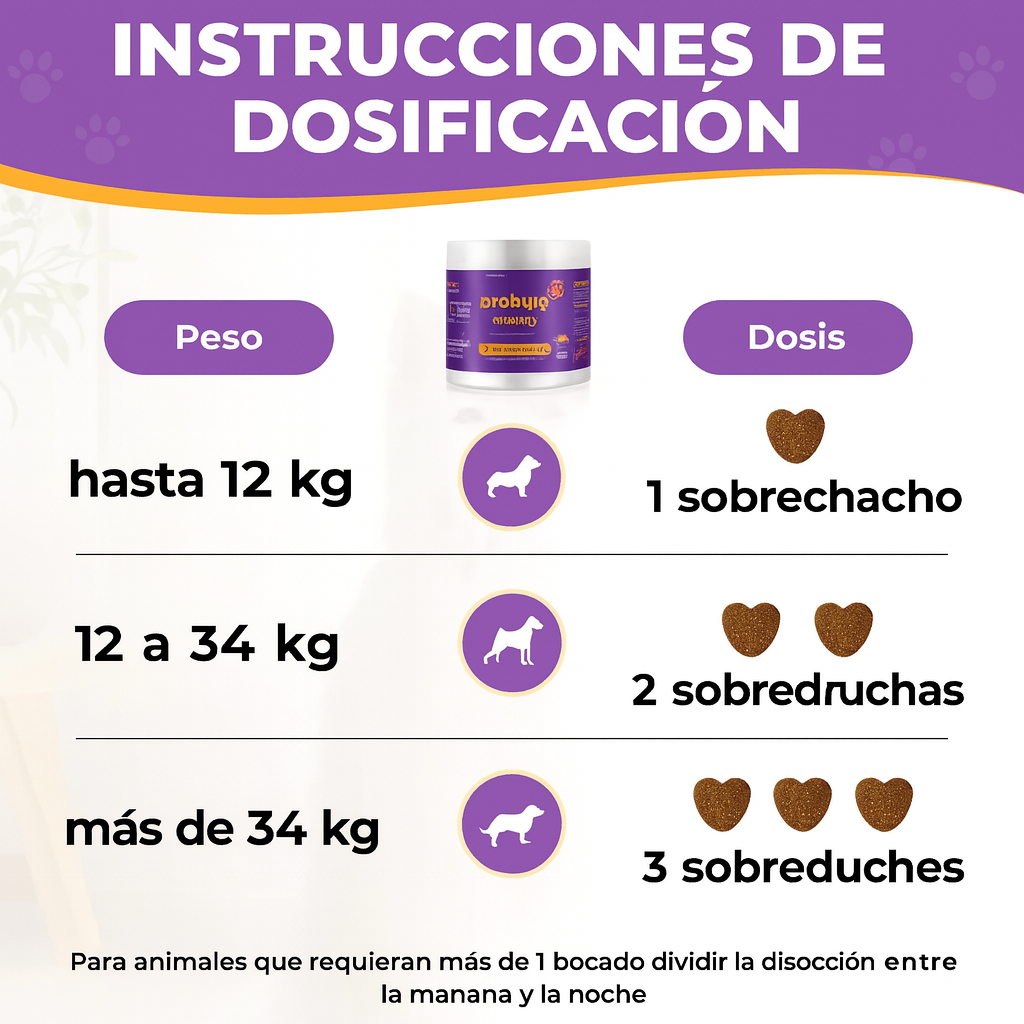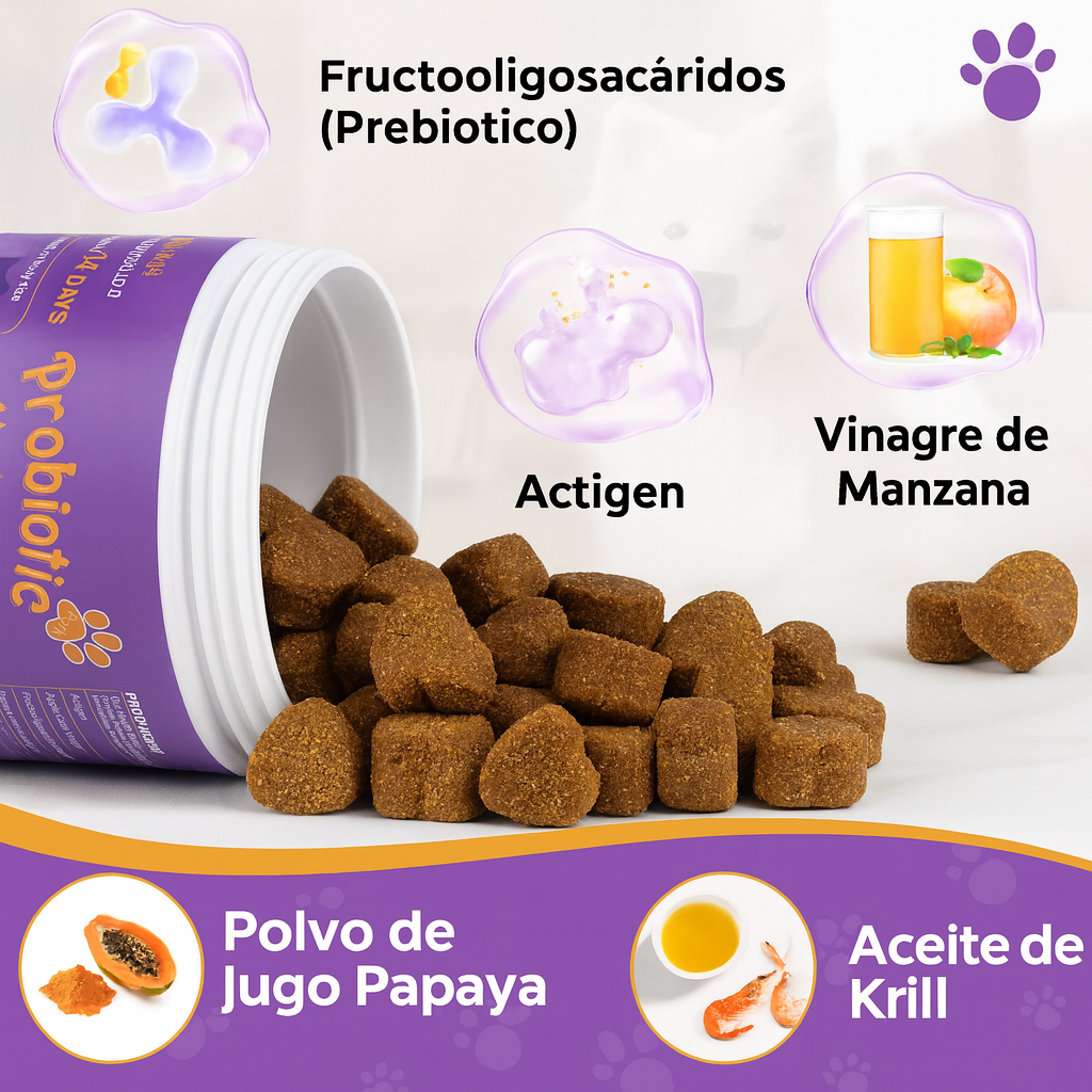 Gracias a su fórmula 8 en 1 con probióticos y vitaminas esenciales, ayuda a reducir alergias, picazón y olores desagradables, fortaleciendo su sistema digestivo y cutáneo.