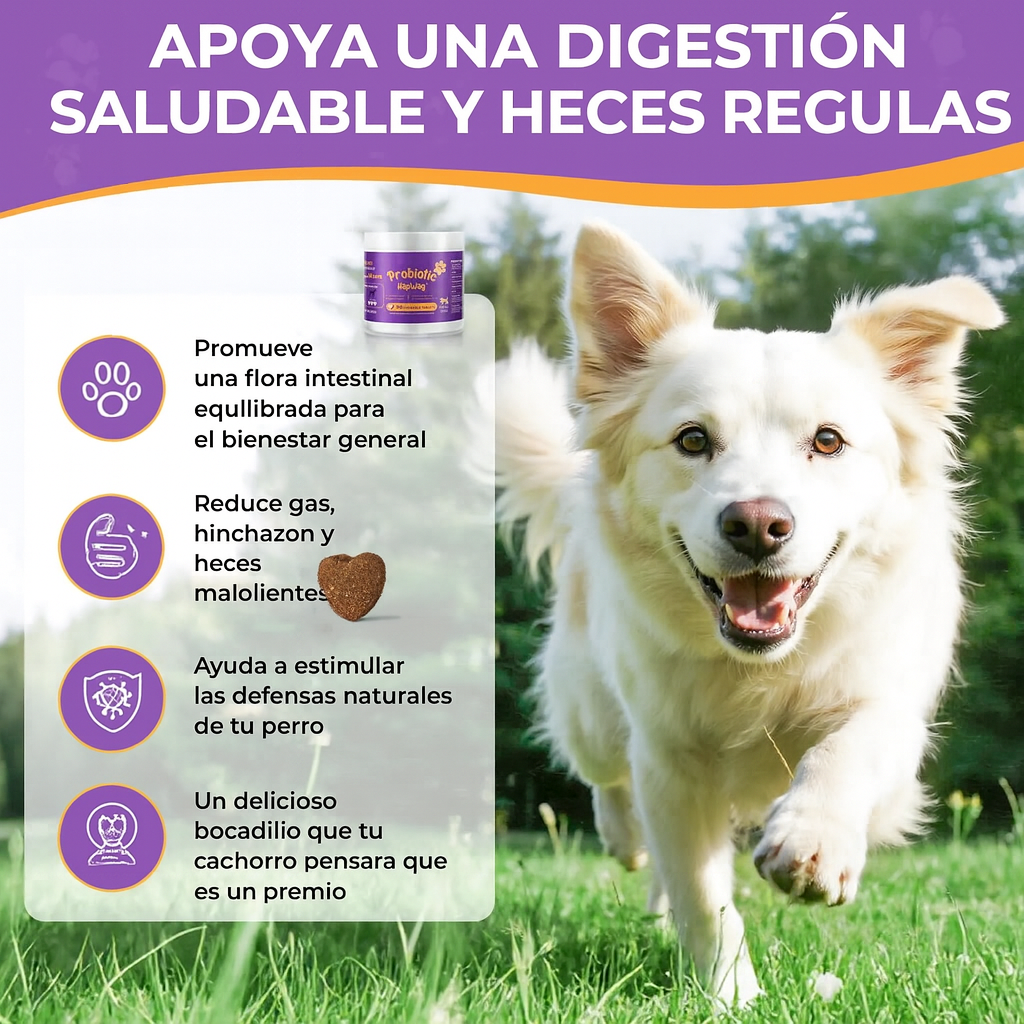 Cada bocado contiene una potente mezcla probiótica que regula el intestino, reduce gases y mejora las heces.